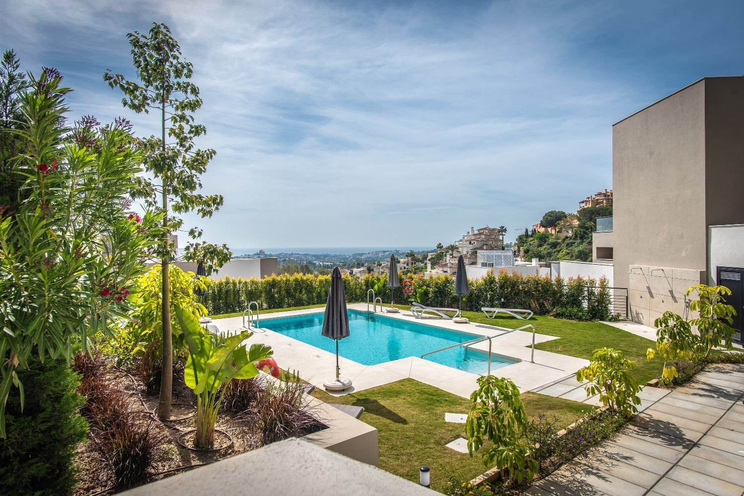 The gated complex offers residents exclusive access to sparkling pools, surrounded by meticulously manicured gardens, providing a serene oasis to relax and unwind.